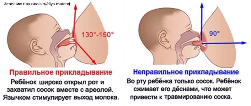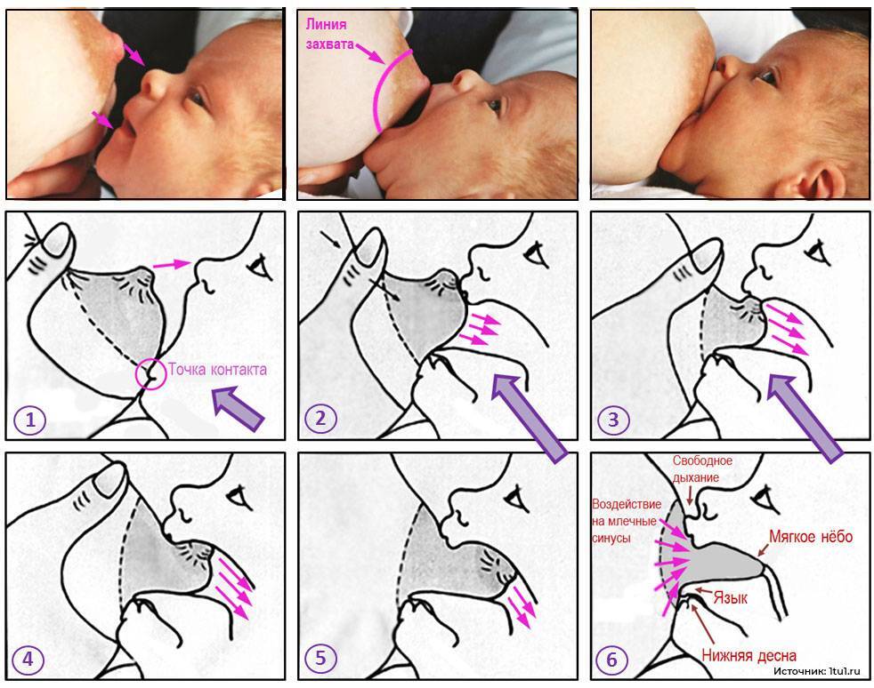 Во время кормления сосок должен быть направлен к нёбу малыша и слегка поддерживаться снизу языком. Захват не должен вызывать дискомфорта, только тянущие ощущения.