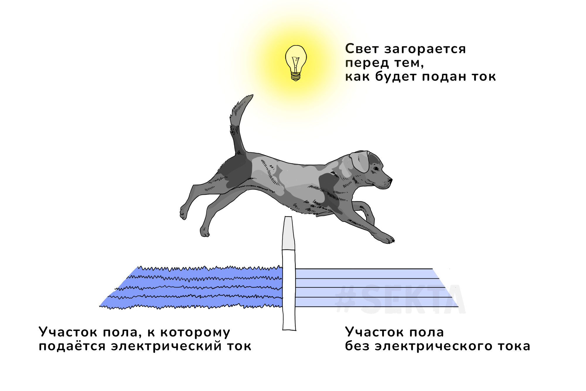 Далее обе группы разместили в наэлектризованные вольеры, из которых можно было выбраться, перепрыгнув через барьер. Заряды продолжили подавать. В итоге та группа, которая усвоила, что избежать заряда можно, легко перепрыгивала через барьер. Животные из другой группы оставались страдать от зарядов, даже не попытавшись спастись.