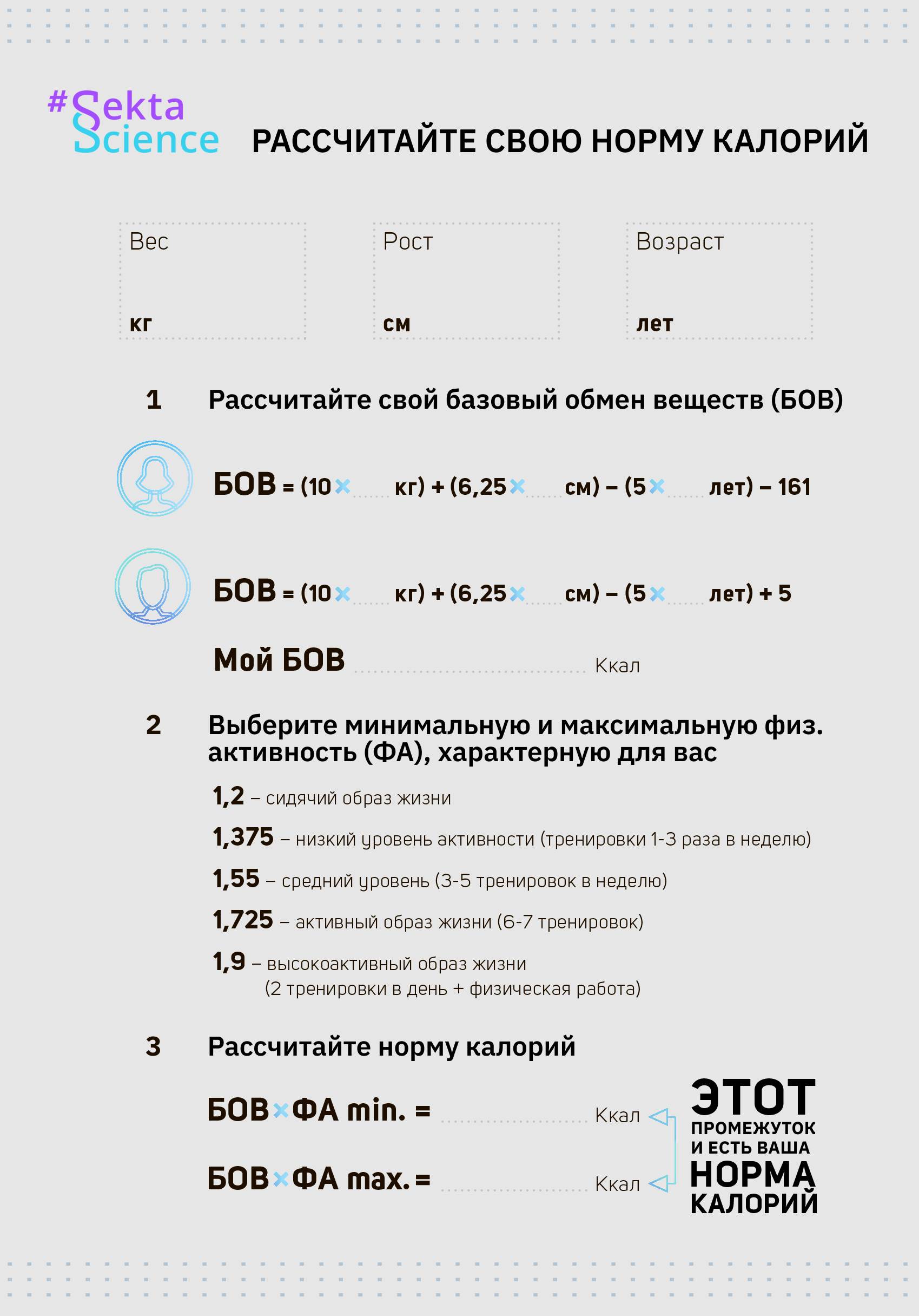 Через неделю оцените, соответствует ли рацион вашей норме калорийности с учётом базового обмена веществ, физической активности и образа жизни.
